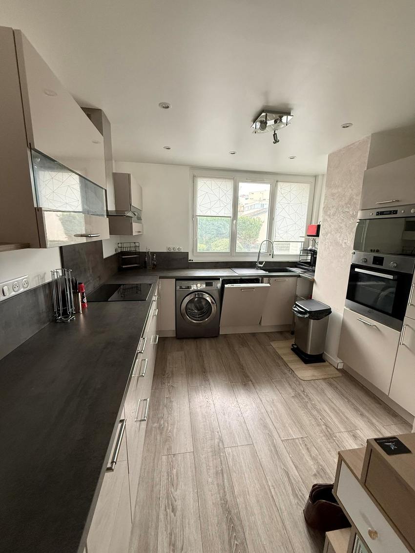 Cuisine équipée : plaque, four, micro-ondes, lave-vaisselle, réfrigérateur, hotte.