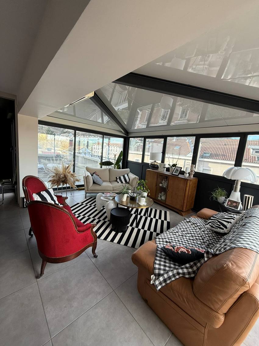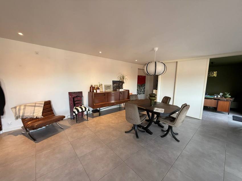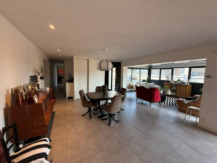 L’espace de vie, aux volumes rares, se déploie sur environ 70 m² et se compose d’un séjour raffiné, d’une cuisine ouverte entièrement aménagée et équipée, ainsi que d’une salle à manger sous véranda, créant une atmosphère chaleureuse et élégante, idéale pour recevoir.